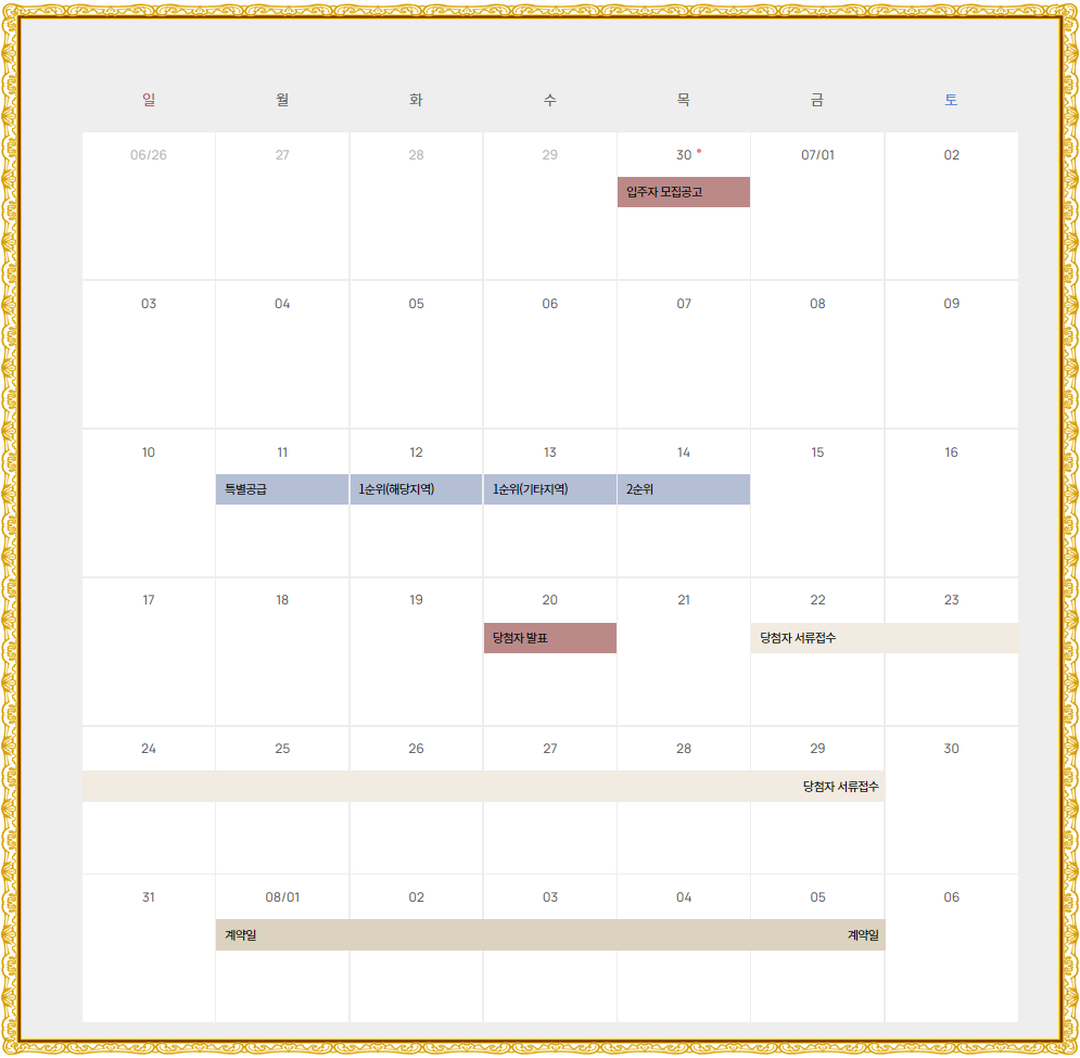 안녕하세요 오늘은 많은 관심을 받고 있는 단지에 관한 내용을 전달해 드리도록 하겠습니다. 우선 일정부터 보도록 하겠습니다. 6월30일 모집공고,7월11일 특별공급, 7월12일 1순위(해당지역), 7월13일(기타), 7월14일 2순위 7월20일 당첨자발표와 8월1일~5일 계약순이며 관심있으신분들은 일정 헷갈리셔서 안되는일 없이 꼭 확인해 주시기 바랍니다.