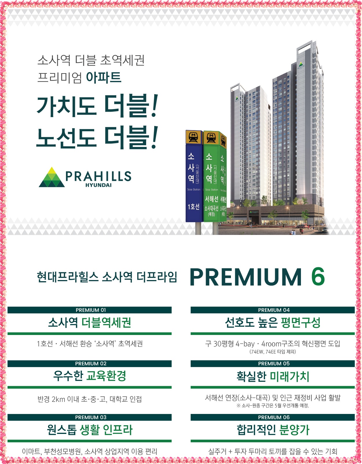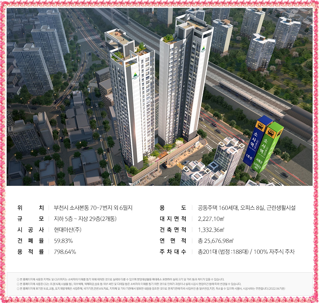 2022년5월27일 현대프라힐스 소사역 모집공고문이 나올것으로 예상되는 현대프라힐스 소사역의 경우 특별공급일은 6월13일, 22일날에는 당첨자 발표가 될것으로 예상되고 있는 단지 입니다. 현장위치는 부천시 수사본동 70-7번지 6필지에서 자리하고 있으면서 단지규모는 지하5F 지상29F 2개동으로 공급 아파160세대 공동주택을 비롯하여 오피스텔 8세대를 제공할것으로 보입니다.